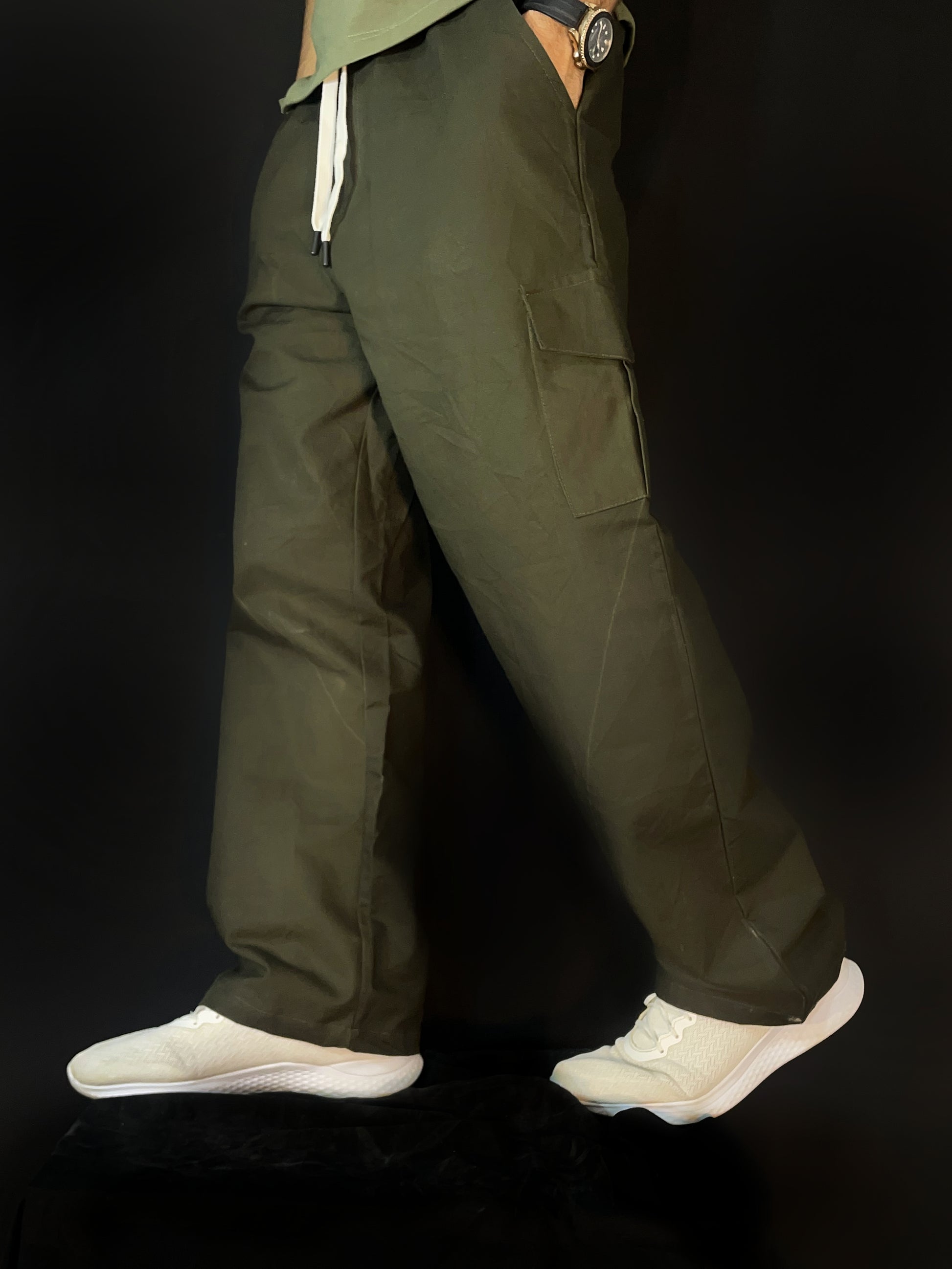 Premium olive cargo trousers made from Twill fabric, designed in a unisex baggy fit for all-day comfort.